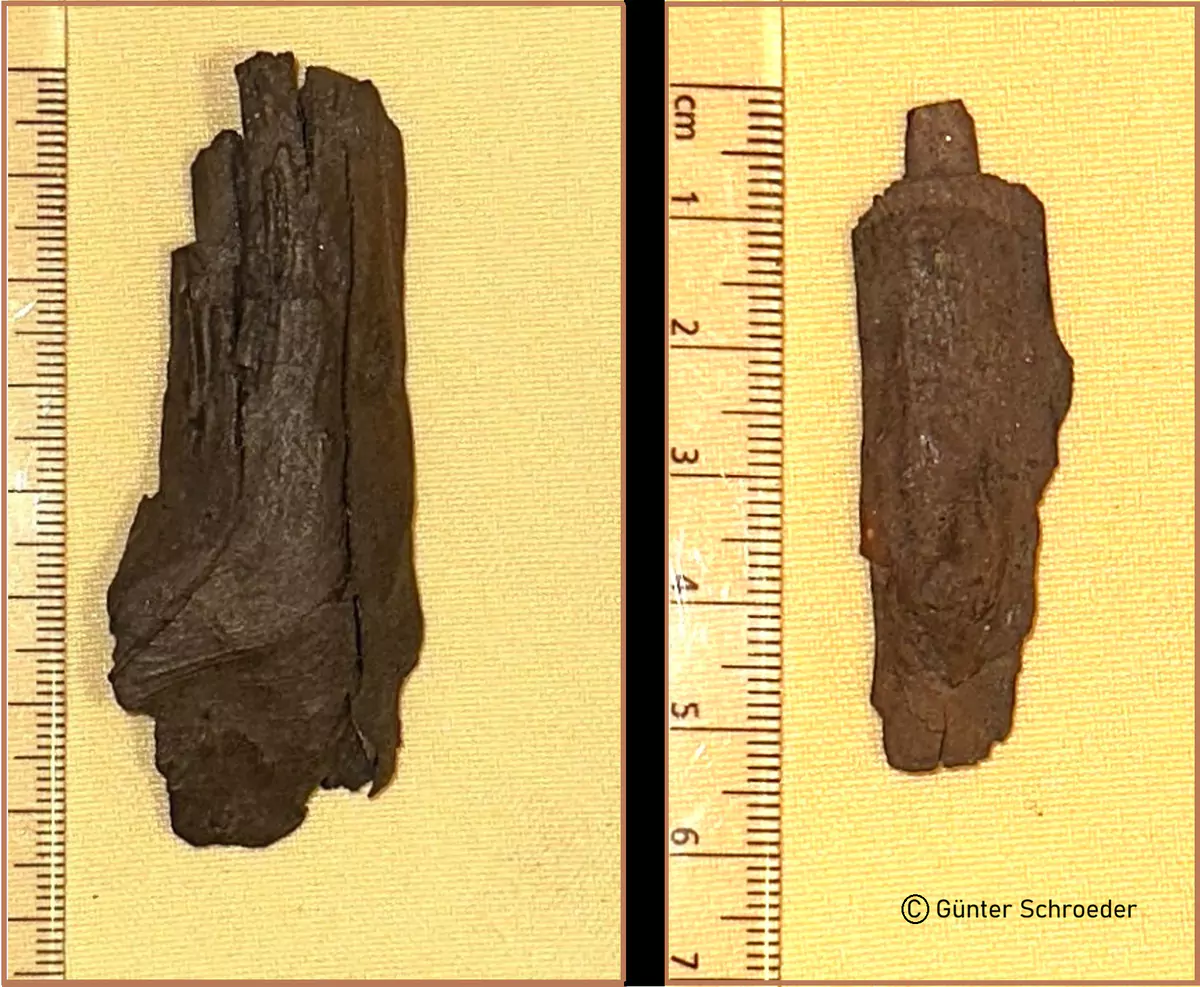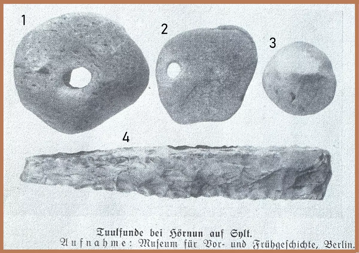 „Er erwähnte dort eine Reihe roher Feuersteingeräte (wahrscheinlich Schaber u. dgl.), einen schönen Behaustein (3), eine durchbohrte, 6 Zoll im Durchmesser haltende und etwa 3 Zoll dicke, in der Mitte durchbohrte Scheibe (1) aus dunkelgrauem Marschton, einen Netzbeschwerer (2) aus rötlichem Sandstein und einen großen Feuersteinmeißel (4), der etwa 10 Zoll lang ist (siehe dazu die Abbildung!). Alle diese Fundsachen hat er in den am Strande liegenden Tuulblöcken des Wattendorfes, die er mit vieler Mühe zerschlug, gefunden“. (weiter)