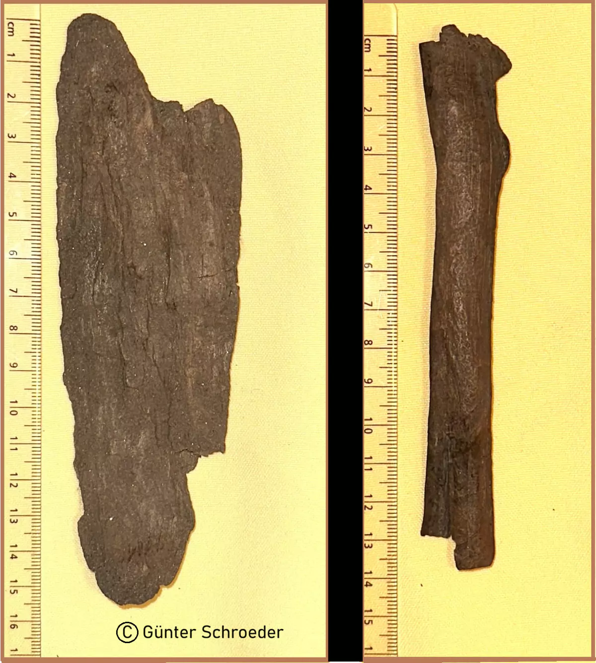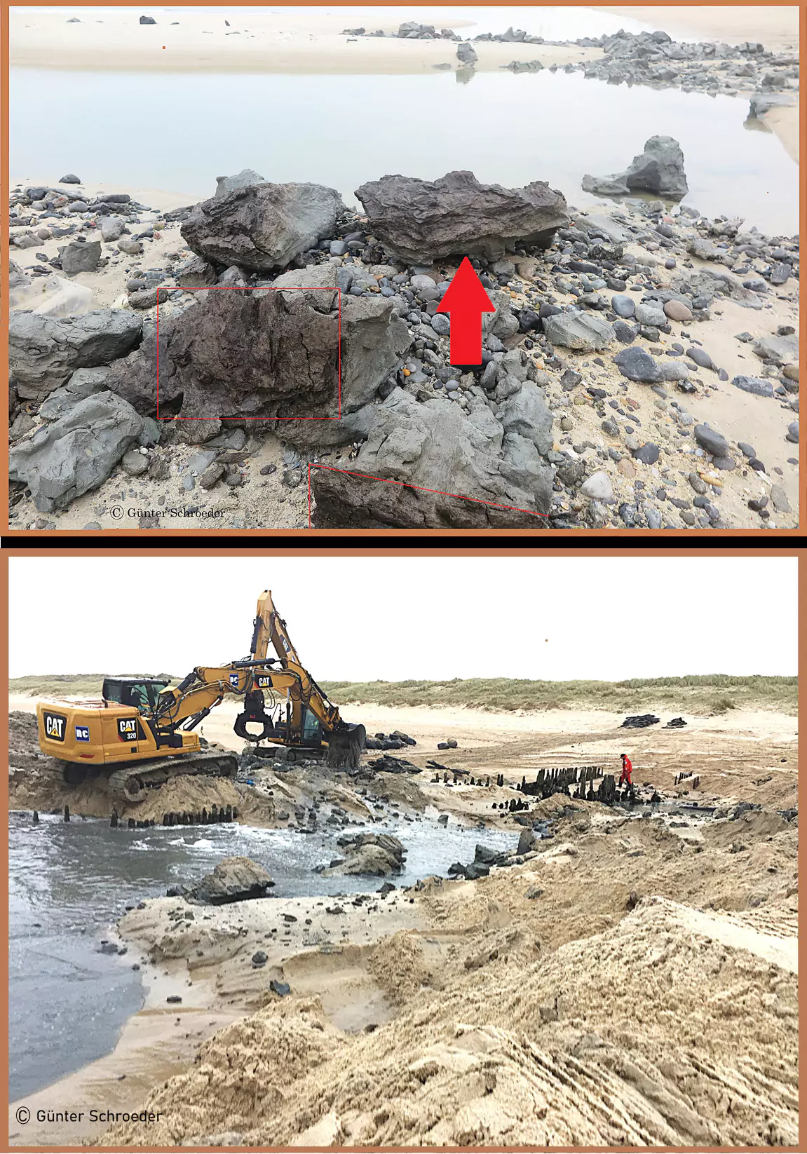 „Am Fuße der Dünen wurde ebenfalls zwischen Klei- und Moorschicht ein Mahlstein mit dazu gehörigem Reibstein ausgegraben. Weiter fanden sich an der gleichen Stelle, unter Mittelhochwasser liegend, zahlreiche Flintsteinabschläge und eine Reihe von flachen Steinen, die vielleicht einst als Decksteine für irgendeinen Zweck gedient haben könnten“.