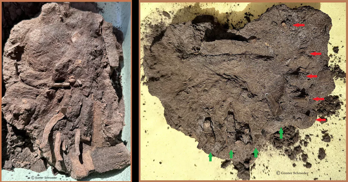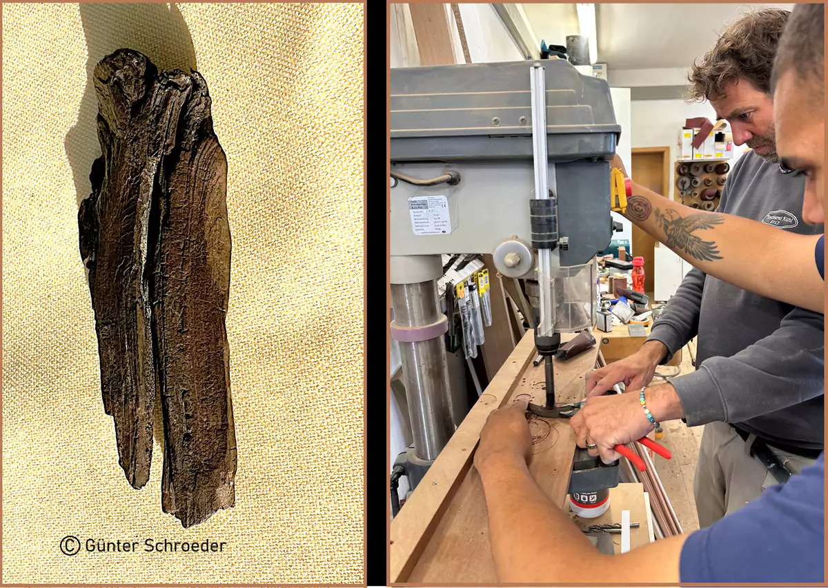 Während einer Sturmflut wurde dieser Torfbrocken unterhalb einer Kleischicht freigespült und von der Meeresbrandung geschliffen. Danach lag der dunkelbraune Brocken auf dem weißen Strandsand und trocknete allmählich. Hierdurch kamen flache, hauchdünne Holzstreifen, zierliche Hölzer und vermutlich Schilfrohr aus dem braunen Torf hervor und gaben dem Torfbrocken ein interessantes Aussehen.