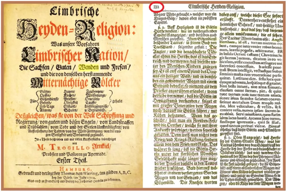 „Es gab auf einem Eiland des Ozeans einen Heiligen Wald und in demselben einen geweihten Wagen, bedeckt mit einem Gewand, das außer dem Priester keiner berühren durfte. Wenn dieser feststellte, dass sich die Göttin im Heiligtum befindet, folgte er dem mit Kühen bespannten Wagen auf dem die Göttin fährt, mit großem Respekt.