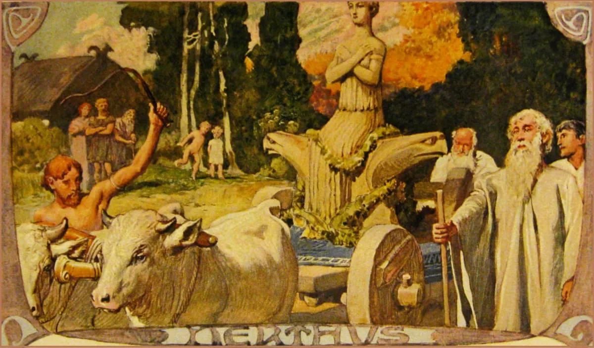 „Der festliche Umzug der Nerthus auf ihrem Wagen. Illustration von Emil Doeplor ca. 1905“.