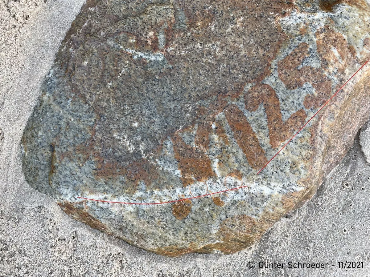 Die Ziffern und mythischen Zeichnungen auf dem Findling sind nicht mit Farbe gemalt oder gemeißelt. Sie wurden in den Stein geätzt.